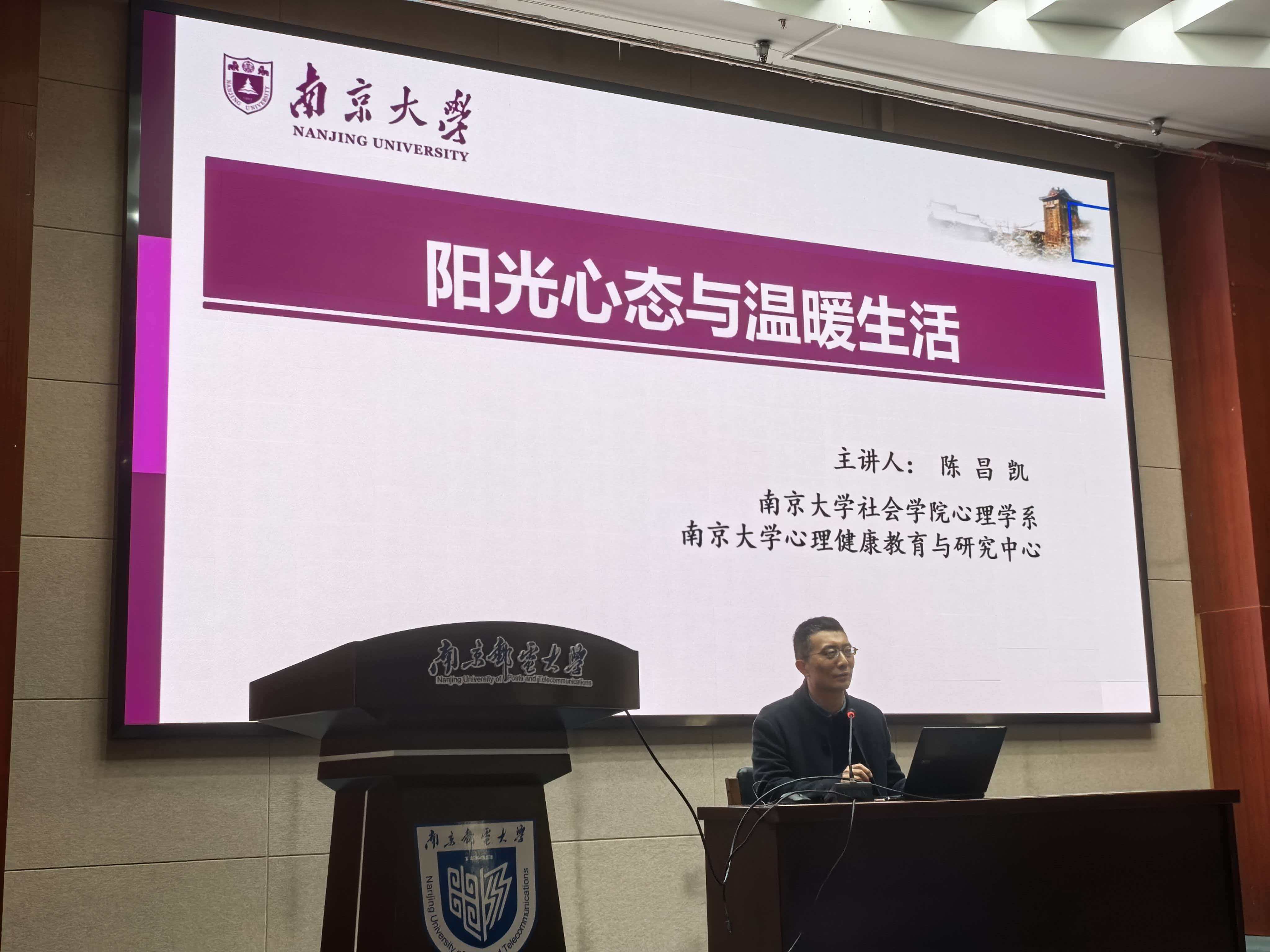 1月12日下午,由党委教师工作部主办的“阳光心态与温暖生活——教师身心健康维护与促进”主题心理讲座在中天科技报告厅顺利举办。讲座特邀南京大学心理健康教育与研究中心陈昌凯主任担任主讲,旨在帮助教师在繁忙工作与教研任务中关注自我情绪、掌握调节方法,以更积极饱满的状态投身育人事业。